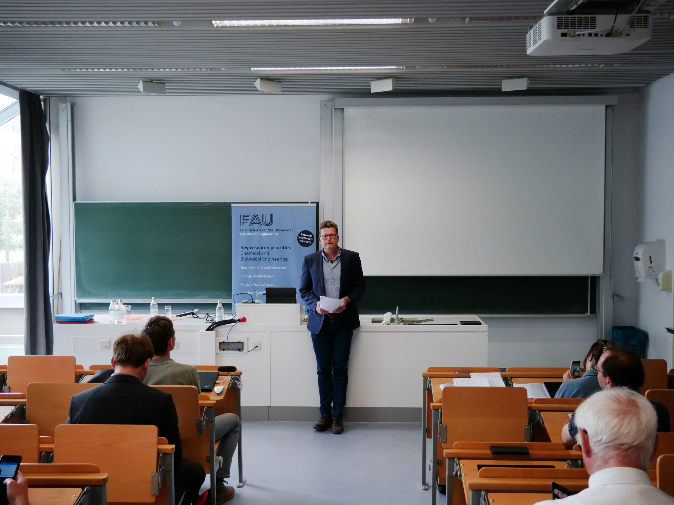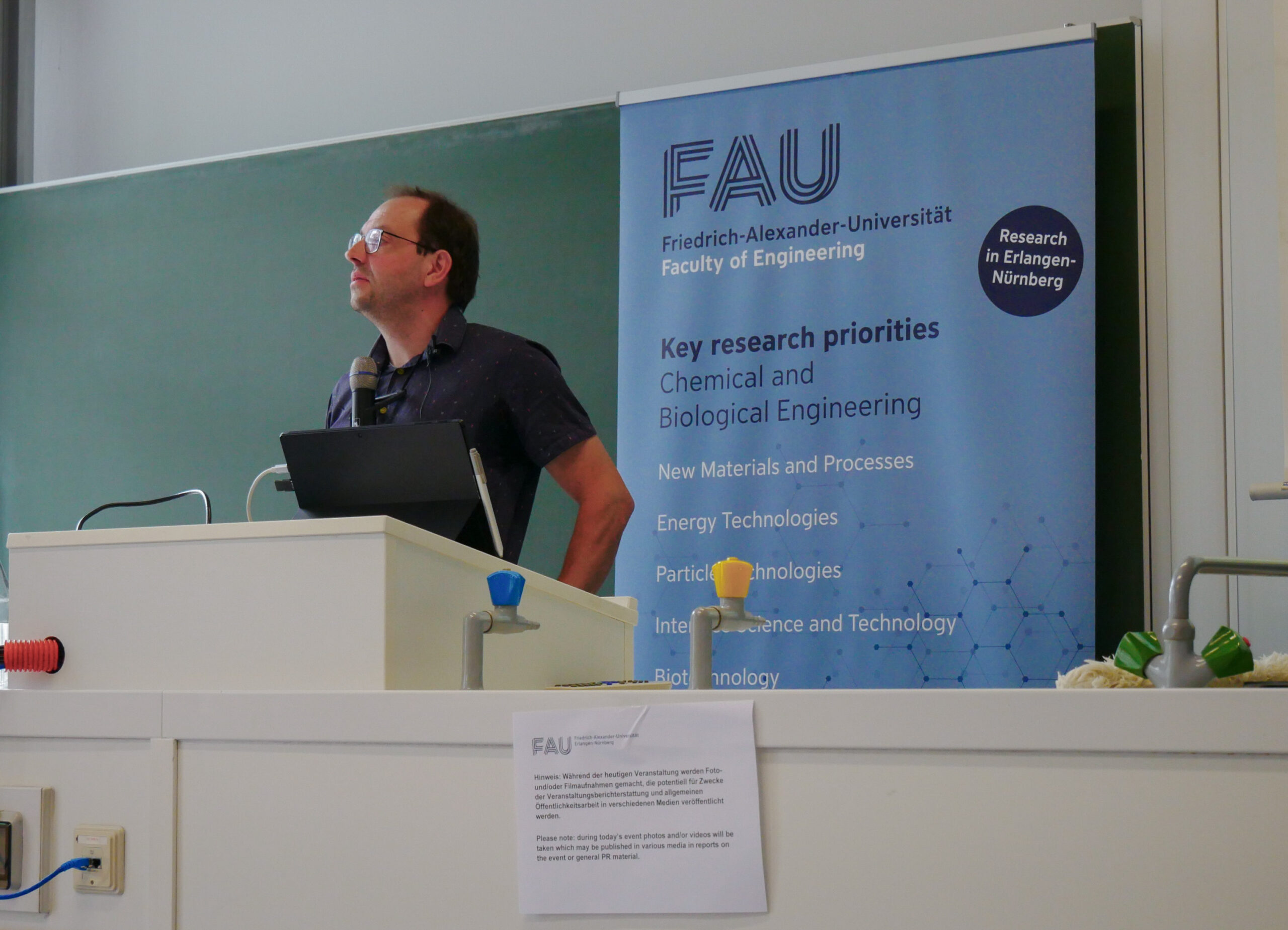 The event was opened with greetings from the department’s spokesperson Prof. Dr. Matthias Thommes and the first Vice Dean Prof. Dr.-Ing. Marc Stamminger. Reflecting on the department’s history, Prof. Dr.-Ing. Stamminger described the CBI as the historical nucleus of the Faculty of Engineering, as Prof. Dr. Hanns Hofmann, the first chair holder of Chemical Reaction Engineering and the first official dean, played a significant role in its establishment. Today, Prof. Dr.-Ing. Stamminger further stated, the pioneering hydrogen research of the CBI is shaping the FAU’s profile.