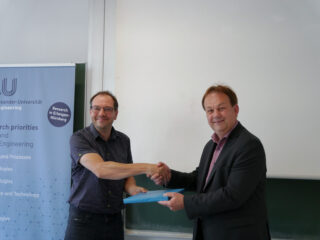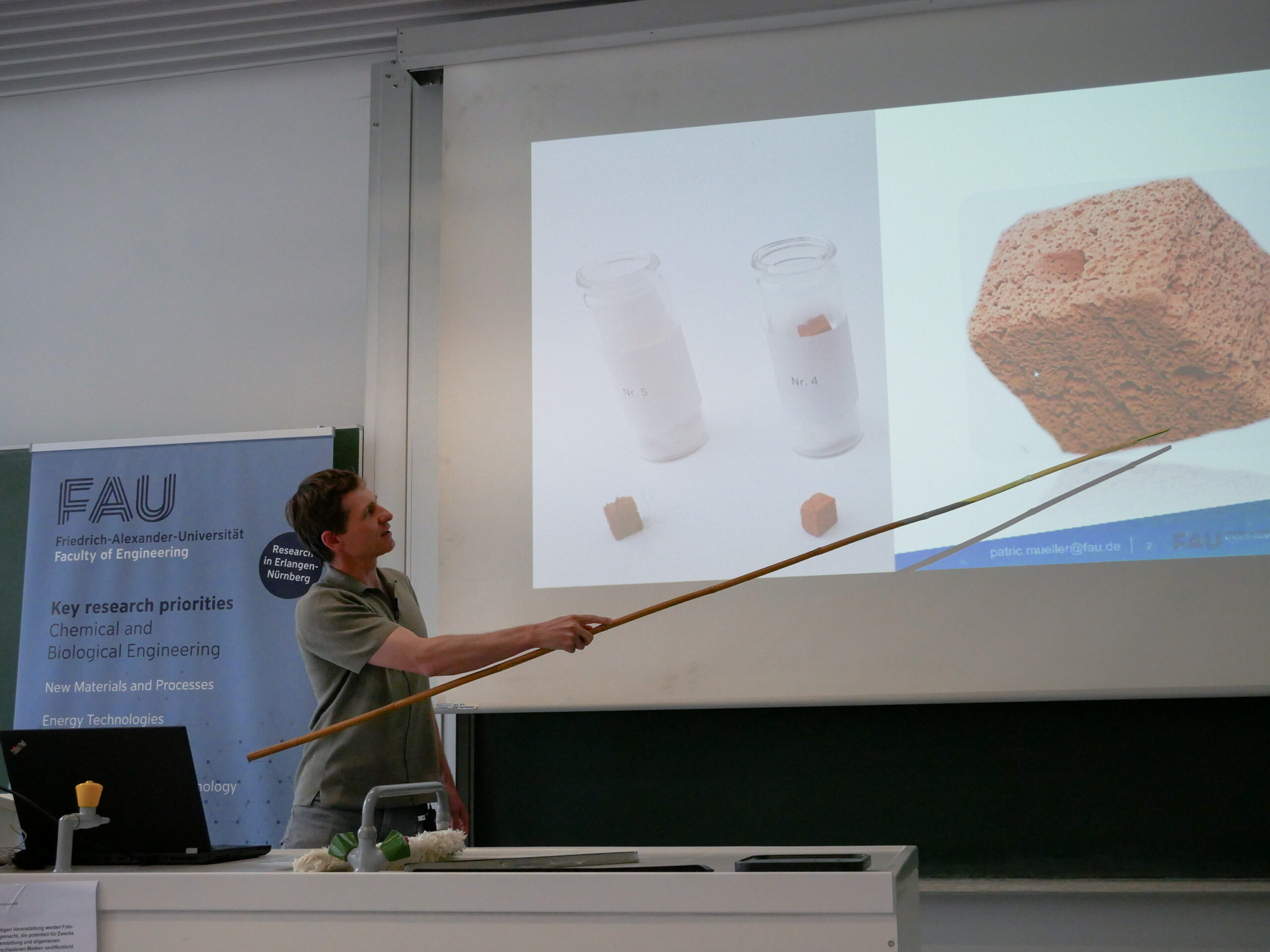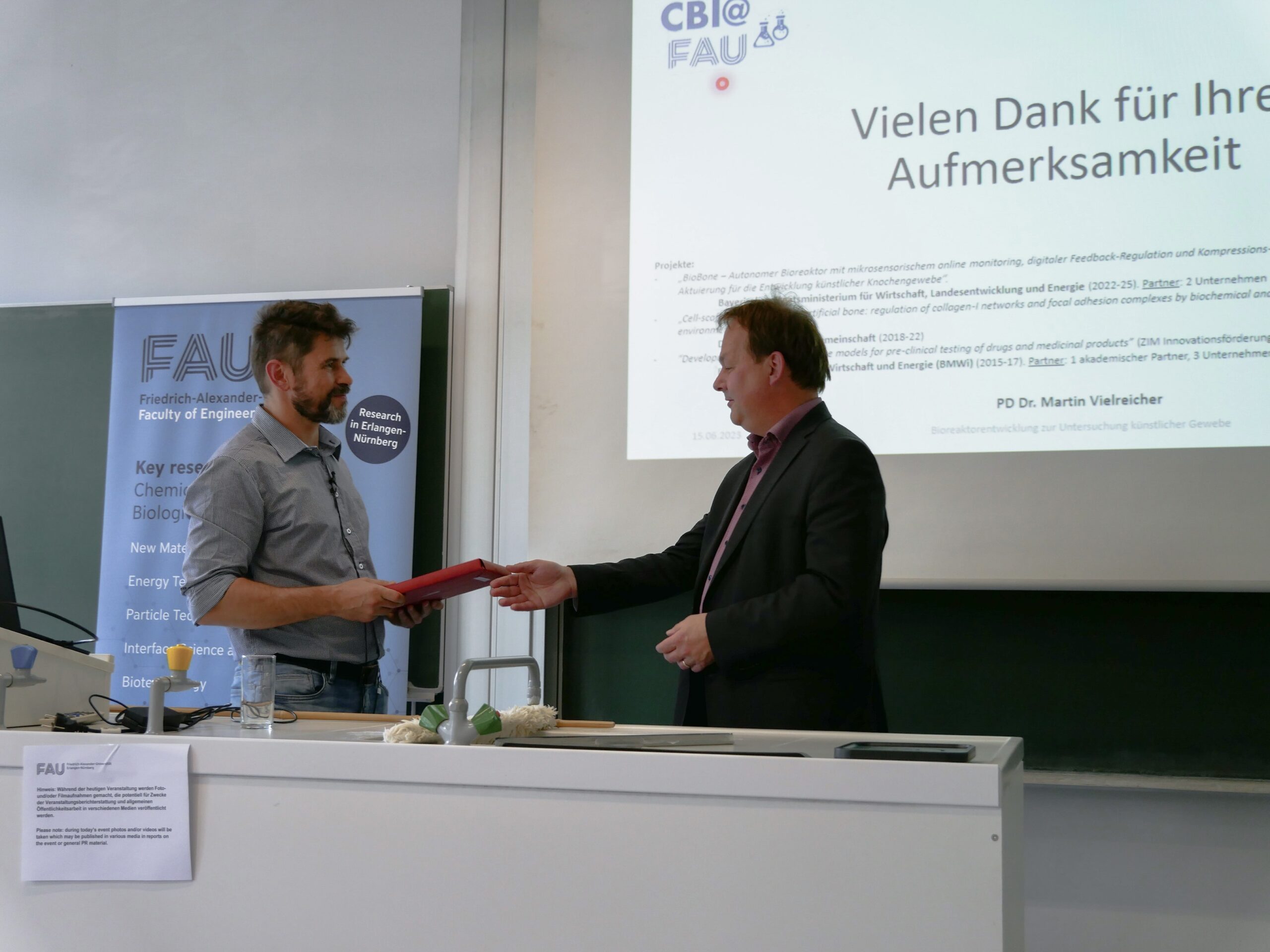 The greeting was followed by three lectures: Prof. Dr. Aljoscha Wahl (Institute of Bioprocess Engineering) presented methods for describing cellular metabolism used in industrial biotechnology. PD Dr. habil. Patric Müller (Institute for Multiscale Simulation) discussed particle-based simulation methods for optimizing thermal insulating materials such as ceramic foams. In the last inaugural lecture, PD Dr. habil. Vielreicher focused on the development of bioreactors for studying artificial tissues. Considering the high demand for artificial bone tissue, his research group collaborates with external partners on an innovative reactor concept for the controlled cultivation of artificial pseudo-vascularized 3D bone tissue.